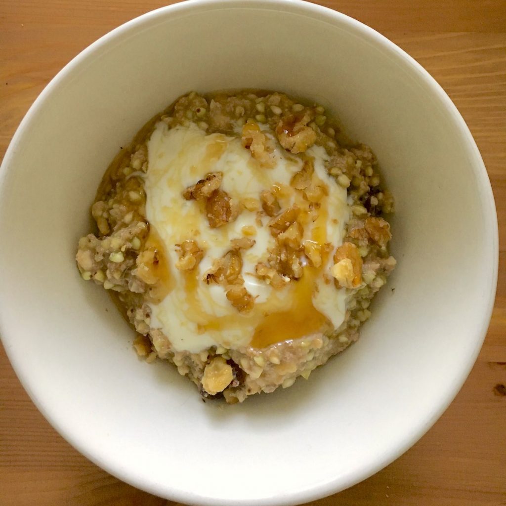 Währenddessen die Banane mit einer Gabel zerdrücken. Wenn der Buchweizen fertig ist, die Banane unterheben, in einer Schüssel anrichten und nach Geschmack toppen. Ich habe noch 2 EL Naturjoghurt (für eine noch cremigere Konsistenz), Walnüsse und etwas Honig hinzugefügt.