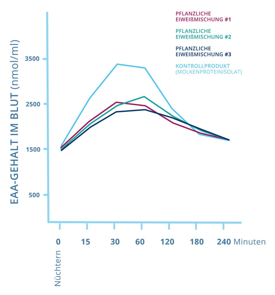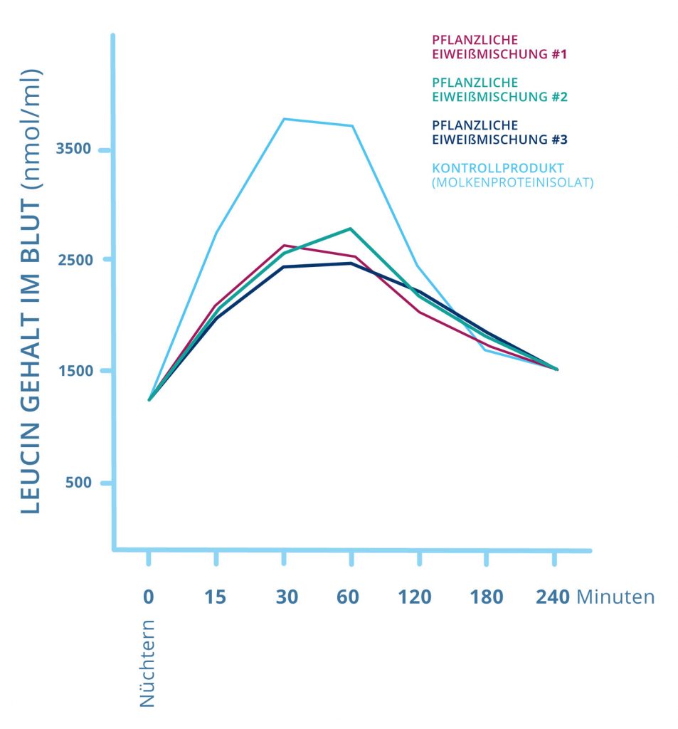 Es wurde festgestellt, dass pflanzliches Eiweiß selbst bei optimiertem Aminosäurenprofil nicht den gleichen EAA- bzw. Leucin-Anstieg im Blut verzeichnen lassen wie beim Molkenproteinisolat. Dennoch: Der Anstieg war im Vergleich zum Ausgangsniveau sehr groß!