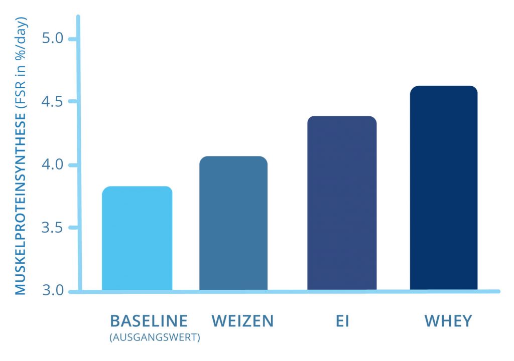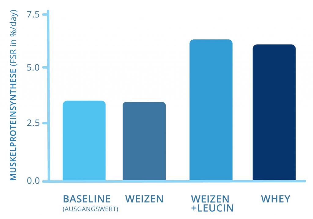 Sobald das Weizenprotein mit Leucin zugesetzt worden ist, sodass die Menge mit Whey identisch war (18,5 g Leucin auf 1 kg Eiweiß), haben in einem zweiten Experiment die Raten der Muskelproteinsynthese signifikant zugenommen!