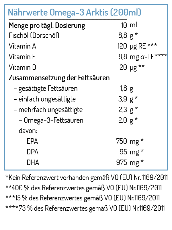 - 2.000 mg Omega-3 pro Tagesdosis (das enspricht 10 ml=1 EL)