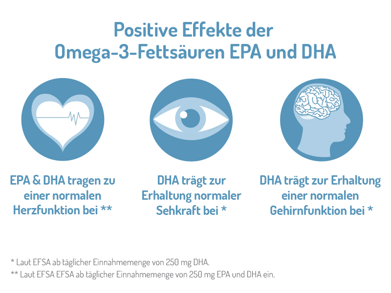 * Positive Bewertung für Omega-3 (EPA und DHA) laut Europäischer Behörde für Lebensmittelsicherheit. Die positive Wirkung stellt sich bei einer gewissen Tagesaufnahme von EPA und/oder DHA ein.