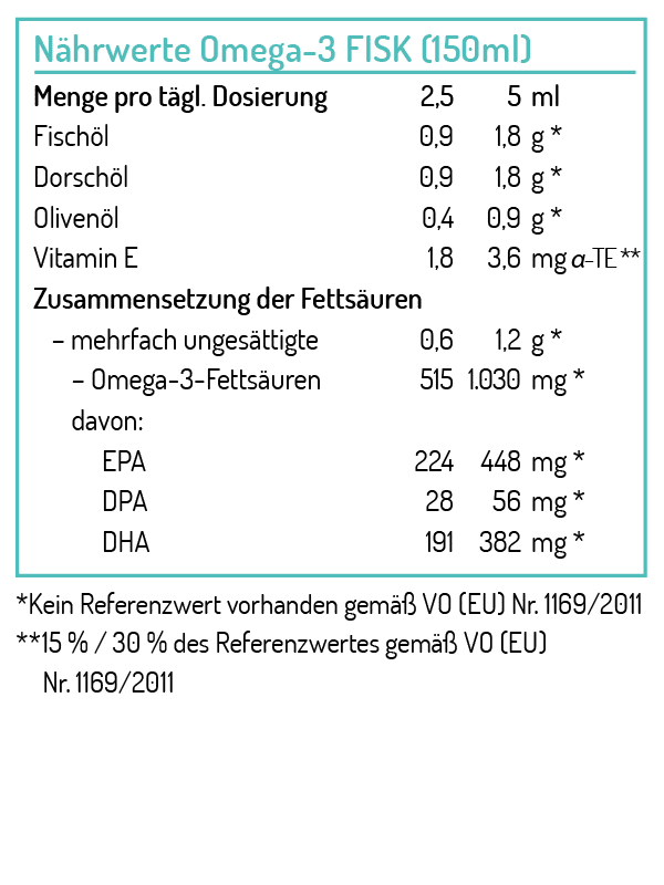 - 1.120 mg Omega-3 pro Tagesdosis (das entspricht 5 ml=1TL)