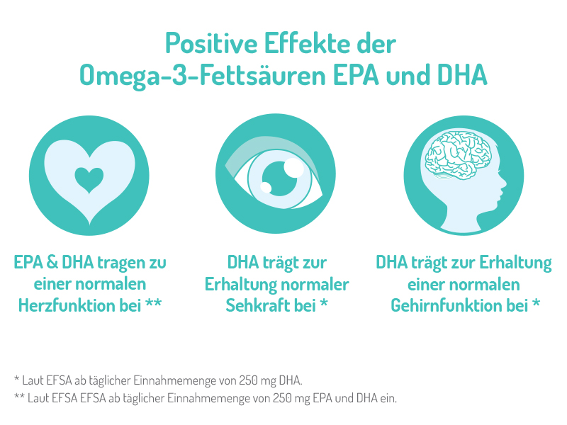 * Positive Bewertung für Omega-3 (EPA und DHA) laut Europäischer Behörde für Lebensmittelsicherheit. Die positive Wirkung stellt sich bei einer gewissen Tagesaufnahme von EPA und/oder DHA ein.