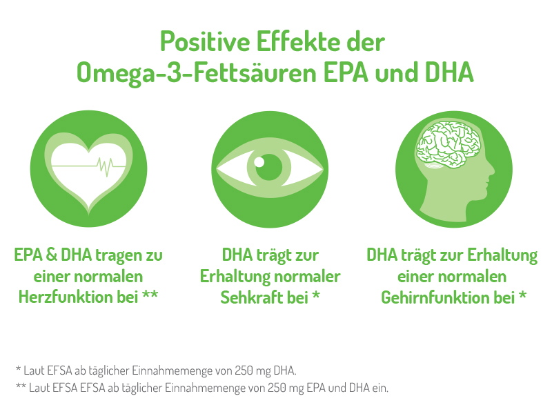 * Positive Bewertung für Omega-3 (EPA und DHA) laut Europäischer Behörde für Lebensmittelsicherheit. Die positive Wirkung stellt sich bei einer gewissen Tagesaufnahme von EPA und/oder DHA ein.