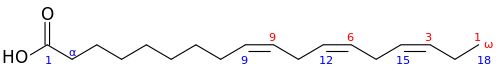 - α-Linolensäure = ALA = 18:3 (ω−3)