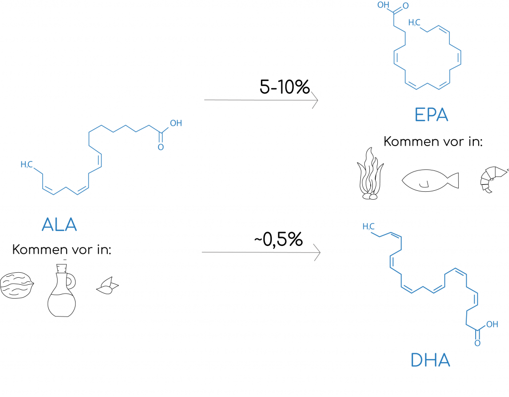 Ja, richtig! ALA kann von unserem Körper in EPA und DHA umgewandelt werden. Allerdings ist es schon seit Jahrzehnten wissenschaftlicher Konsens, dass diese Umwandlungsraten wirklich nicht gut sind.