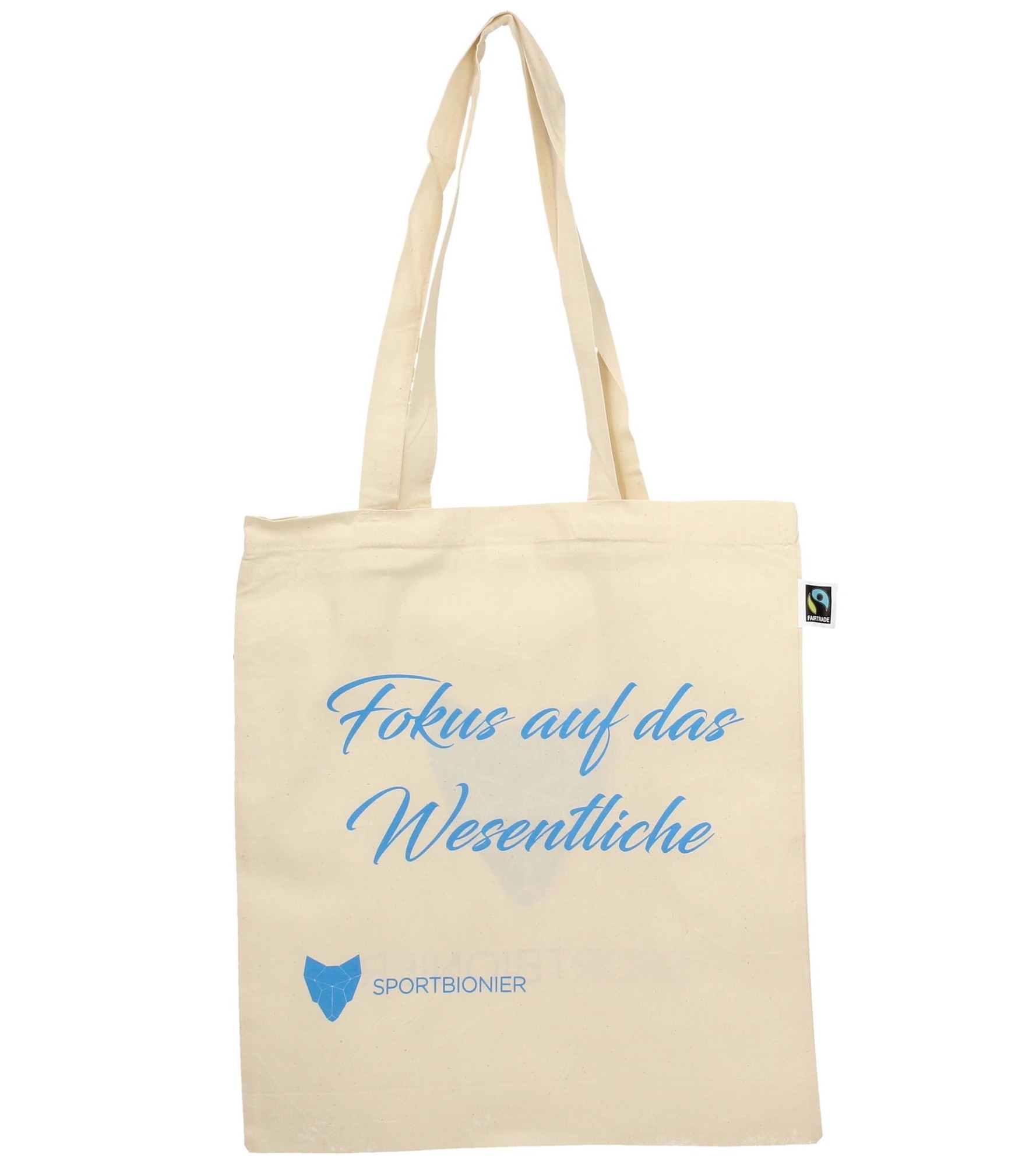 Die Baumwolltasche besteht zu 100% aus Bio Baumwolle und hat das FairTrade Siegel.